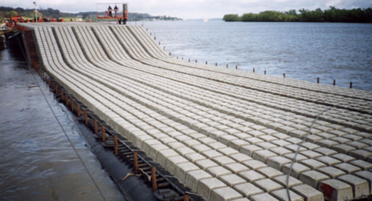 Se compraron dos mallas geotextiles: una de 600 x 100 metros y la otra de 300 x 100 metros. Ambas están adosadas con cemento al lecho, contienen la arena y la protegen de la corriente.